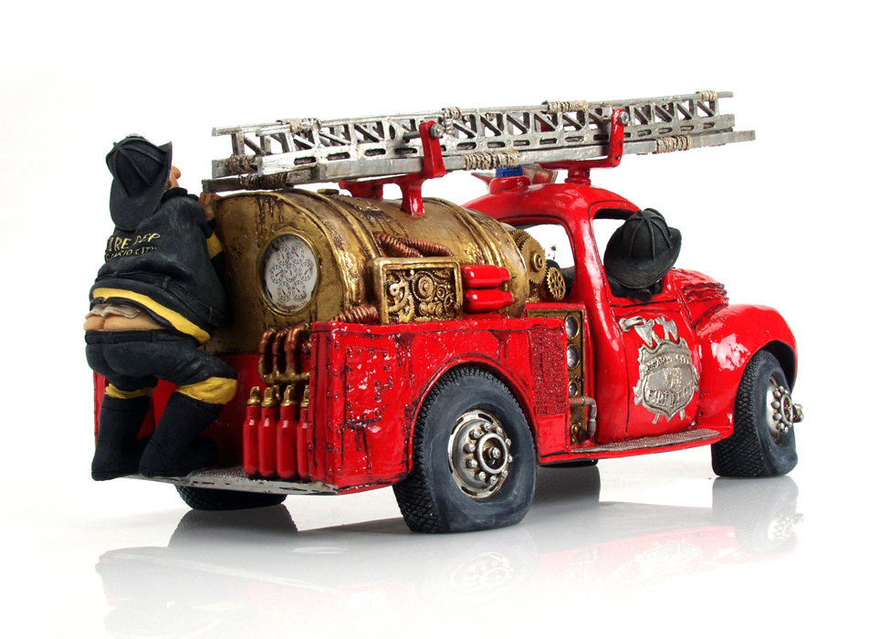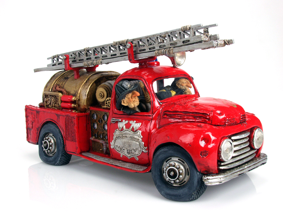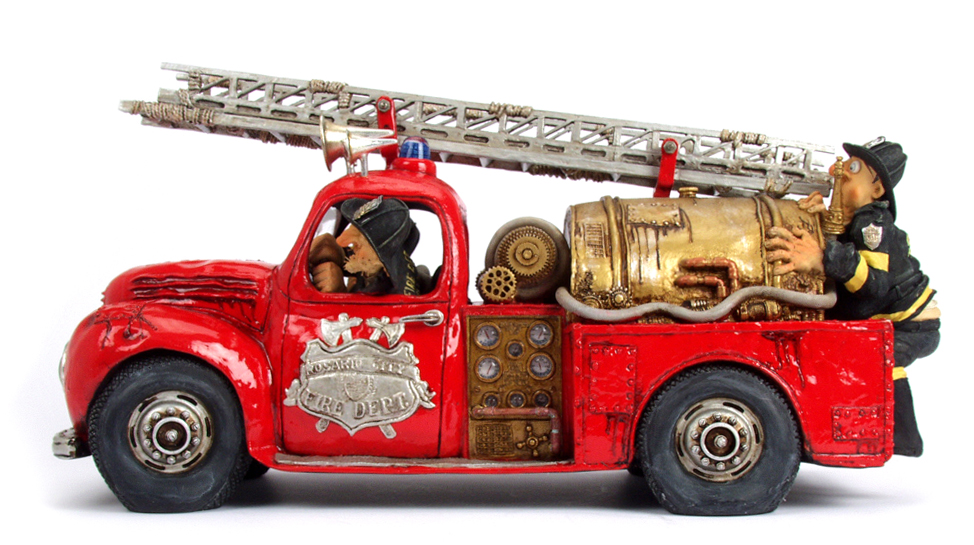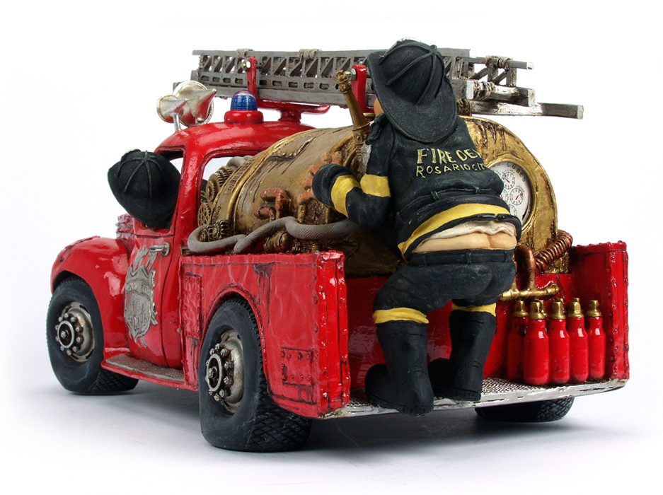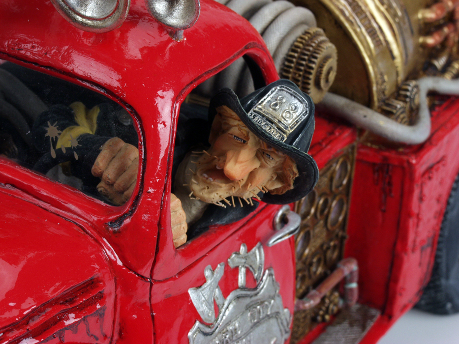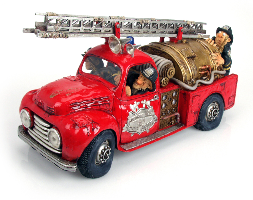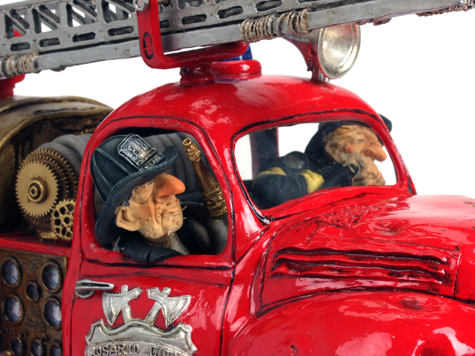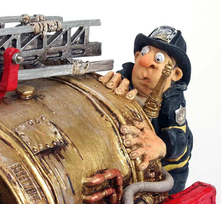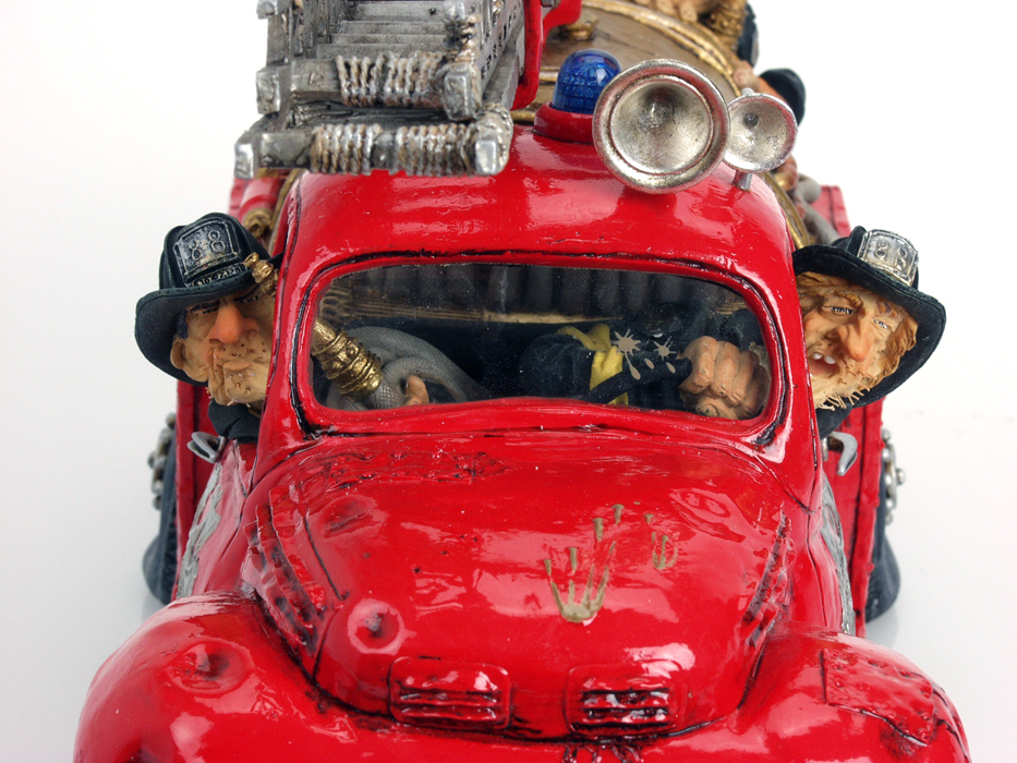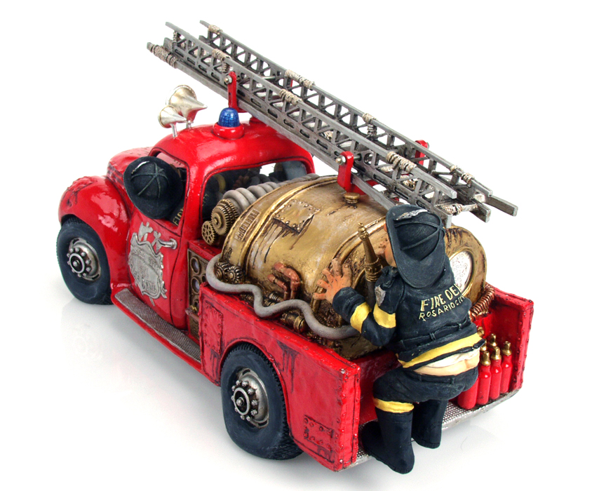 Eine Reihe ironischer und ungewöhnlicher Szenen wie: überbelastete alte Autos zur Ferienabreise bereit,Flugzeuge, Motorräder, Militaerdiktatoren in motorisierten Badewannen, eine Mischung aus komischenPersöhnlichkeiten und seine Serie ironischer zweidimensionaler Tableaux, die die Absurdität der modernenWelt darstellen DIE GESCHICHTE: Ohrenbetäubend heulte die Sirene durch die belebten Straßen von Rosario City, als mit hoher Geschwindigkeit der Feuerwehrwagen vorbeiraste. Vollkommen perplex beobachteten die Passanten, wie außerordentlich geschickt sich das enorme Fahrzeug im Zickzackkurs seinen Weg durch ein wahres Meer von Autos bahnte. Und tatsächlich schafften es die tapferen Feuerwehrleute nach einer nur zehnminütigen Vollgasfahrt gerade noch rechtzeitig zum Einsatzort, und konnten Mimi, die Katze der zauberhaften blonden Maria Alicia Vicari, vor einem Sturz vom Baum retten, wo sie in der Sonne ihre Siesta hielt. 45 Minuten lang kämpften unsere Helden, riskierten und kassierten so manchen Kratzer und Biss. Letztendlich jedoch gelang es ihnen, das widerspenstige Tier aus dem Baum zu holen. Unter dem Applaus der Nachbarn konnte man das Kätzchen wieder seiner Besitzerin überreichen, die es unglücklicherweise sofort wieder entwischen ließ. Mit einem unnachahmlichen Satz sprang das reizende Tierchen wieder in den Baum und schaffte es dieses Mal sogar, noch höher zu klettern. Glücklicherweise hatte man die Leiter noch nicht wieder eingefahren. |