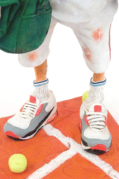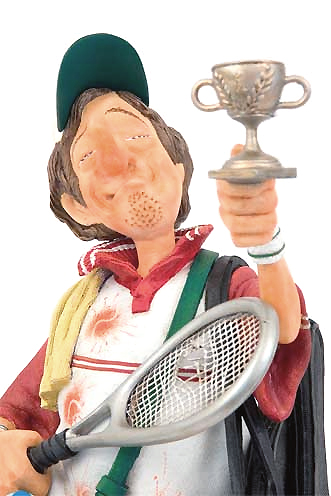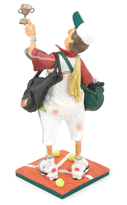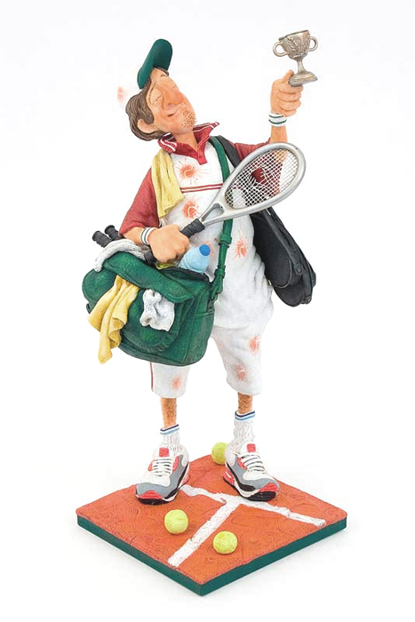 Die Mischung aus Forchinos großen Sinn für Humor, mit einem starken Hauch Ironie verbunden, haben zur Comic Kunst Forchinos geführt. Die limitierten und nummerierte Editionen seiner Figuren sind begehrte Objekte für Liebhaber und Sammler. Überzeugen Sie sich selbst von der Qualität dieser fantastischen Arbeiten, die unter der ständigen Kontrolle des Künstlers Guillermo Forchino stehen. DIE GESCHICHTE: Der Pokal, von welchem er so oft geträumt hatte, dass er ihn in seiner Hand halten würde, wurde Realität. Weder seine verstauchte Schulter, noch die schreckliche Sehnenentzündung in seinem linken Arm konnten den ausdauernden Gustavo Lanzaro davon abhalten, den Pokal, den er gerade gewonnen hatte, in die Höhe zu halten. Die Geschosse, die sein Gegner mit 249 km/h feuerte konnten vier seiner Schläger brechen aber nicht seine Moral. Sein Trainer, der berühmte Spanier Pepe Galetta, brachte ihn, inspiriert von den bekannten Serrano Schinken, dazu, eine strikte Diät von ausschließlich Eicheln für die Dauer eines Jahres einzuhalten. Die harten Monate des Trainings waren furchtbar aber verglichen mit solch einem Erfolg erschien das Opfer angemessen. Das einzige Unangenehme war der tierische Mundgeruch, der einfach nicht weggehen wollte und seine große Abscheu für den Spanischen Schinken. |