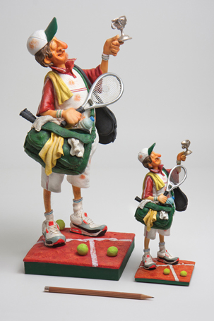 Die Mischung aus Forchinos großen Sinn für Humor, mit einem starken Hauch Ironie verbunden, haben zur Comic Kunst Forchinos geführt. Die limitierten und nummerierte Editionen seiner Figuren sind begehrte Objekte für Liebhaber und Sammler. Überzeugen Sie sich selbst von der Qualität dieser fantastischen Arbeiten, die unter der ständigen Kontrolle des Künstlers Guillermo Forchino stehen. DIE GESCHICHTE: Der Pokal, von welchem er so oft geträumt hatte, dass er ihn in seiner Hand halten würde, wurde Realität. Weder seine verstauchte Schulter, noch die schreckliche Sehnenentzündung in seinem linken Arm konnten den ausdauernden Gustavo Lanzaro davon abhalten, den Pokal, den er gerade gewonnen hatte, in die Höhe zu halten. Die Geschosse, die sein Gegner mit 249 km/h feuerte konnten vier seiner Schläger brechen aber nicht seine Moral. Sein Trainer, der berühmte Spanier Pepe Galetta, brachte ihn, inspiriert von den bekannten Serrano Schinken, dazu, eine strikte Diät von ausschließlich Eicheln für die Dauer eines Jahres einzuhalten. Die harten Monate des Trainings waren furchtbar aber verglichen mit solch einem Erfolg erschien das Opfer angemessen. Das einzige Unangenehme war der tierische Mundgeruch, der einfach nicht weggehen wollte und seine große Abscheu für den Spanischen Schinken. |