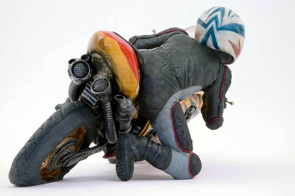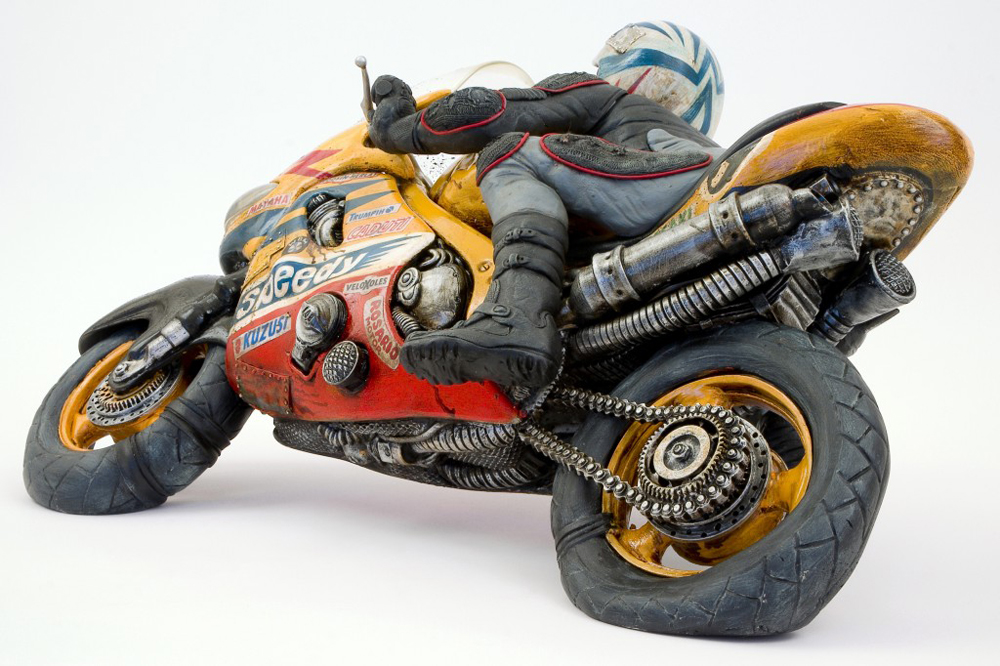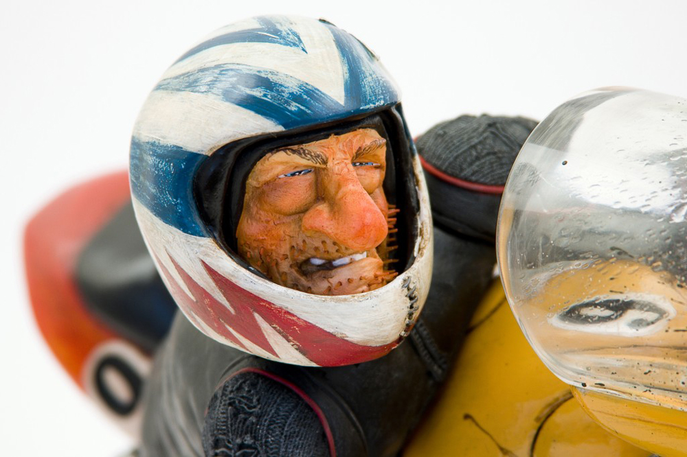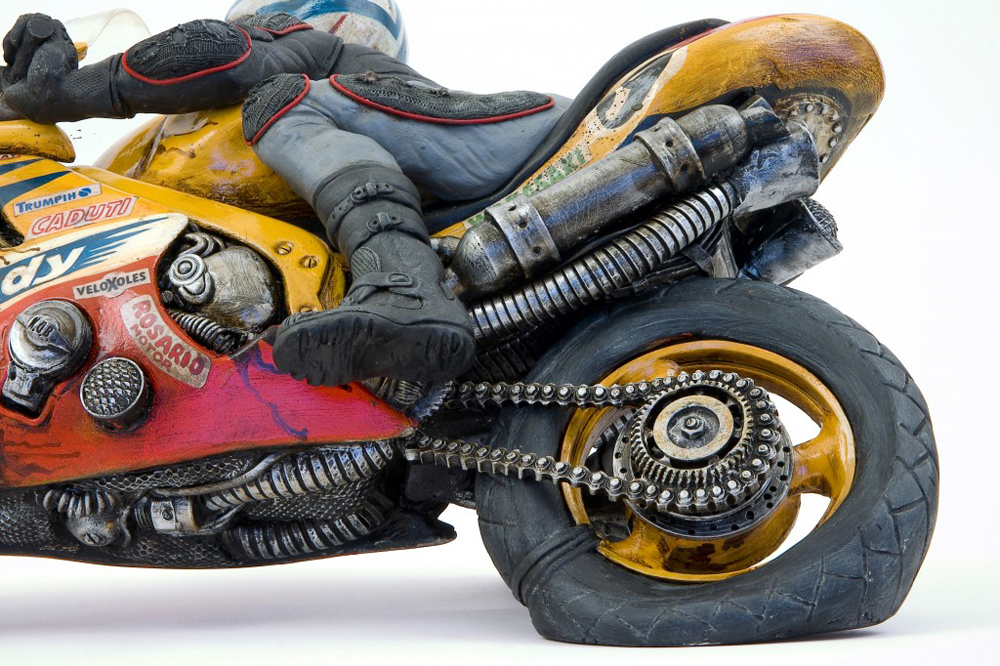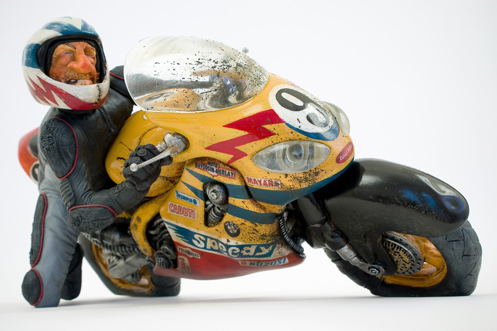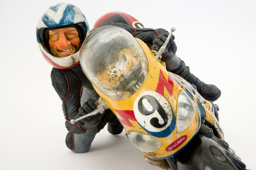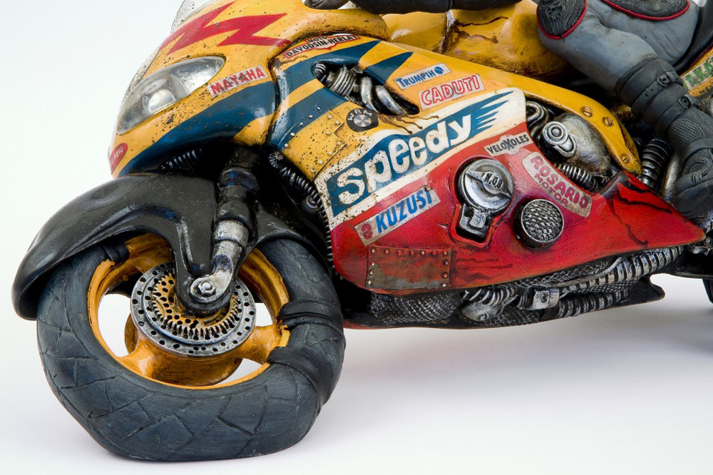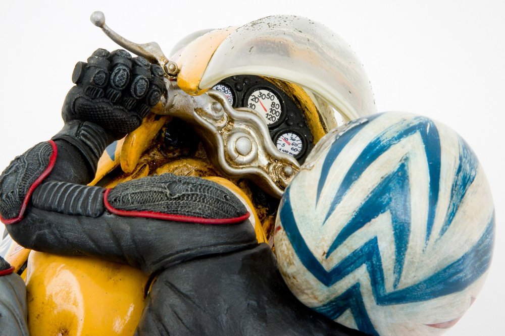 Jeder einzelne Guillermo Forchino Artikel ist in einem einzigartigen Forchino Zeitungspapier verpackt und mit einem Spezialetikett versehen. Auf dem Etikett und dem Aufkleber auf dem Boden jeder Verpackung ist wiederum die einmalige Nummerierung vermerkt. In jeder Verpackung befindet sich eine Broschüre mit der Autobiographie von Guillermo Forchino sowie ausgewählte Abbildungen der Gesamtkollektion. Letztlich liegt ein nummeriertes Zertifikat der Verpackung bei, um die Echtheit des Guillermo Forchino Produktes zu beweisen. Es war als würde das Motorrad jede Minute auseinander fallen. Das Ohrenbetäubende Geräusch des Motors und die Vibration waren Zeichen der extremen Motorstärke. Jedes Mal wenn er beschleunigte hinterließ er eine riesige Staubwolke, sehr zum Leidwesen der nachfolgenden Fahrer. Die ausgelassenen Zuschauer ermutigten den berühmten Fahrer jedes Mal wenn er vorbeikam sie von Kopf bis Fuß nass zuspritzen. Ercila Der Rote war daran gewöhnt bei jedem Rennen Kopf und Kragen zu riskieren. Seitdem Ärzte seine Kniescheibe durch eine Metallplatte ersetzt haben sprühen Funken, wenn er in einer Kurve mit dem Knie den Asphalt berührt. Am Ende des Rennens feiern ihn seine Fans und umarmen ihn so heftig das er fast zerquetscht wird. Seine Rennkombi ist derart durchgeschwitzt das er an der Stelle wo er stand eine riesige Pfütze hinterlässt. Glücklich und zufrieden mit seiner Leistung geht Der Rote mit einem Lächeln auf den Lippen Richtung Umkleidekabinen.. |