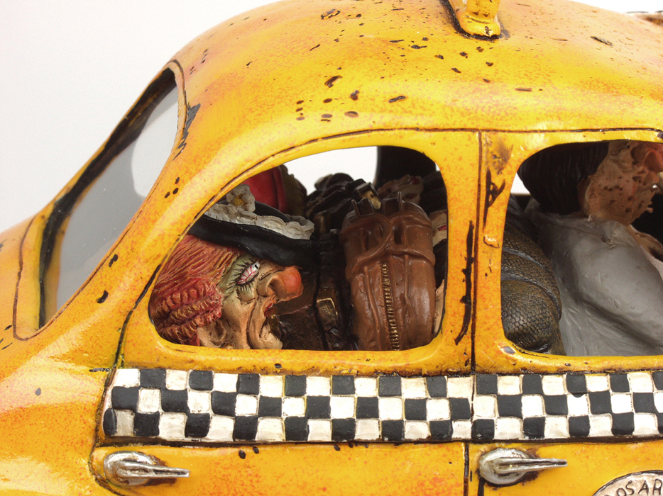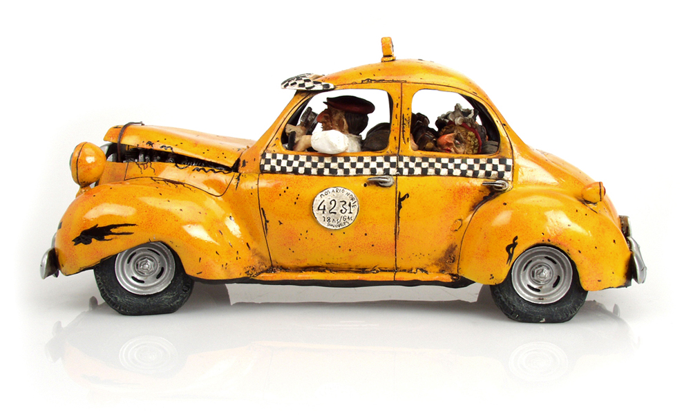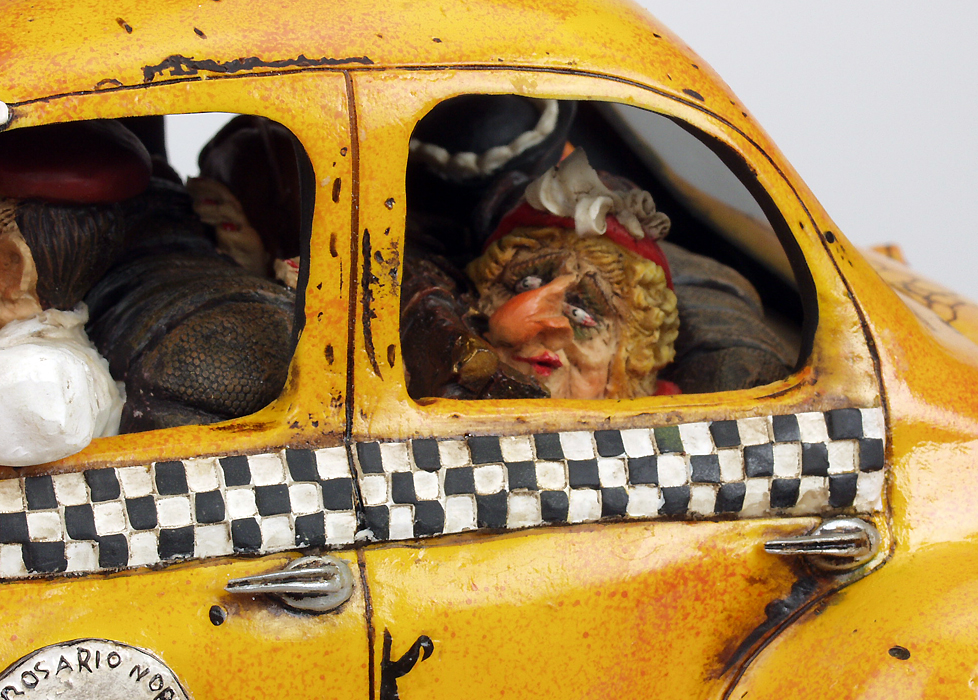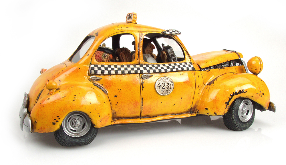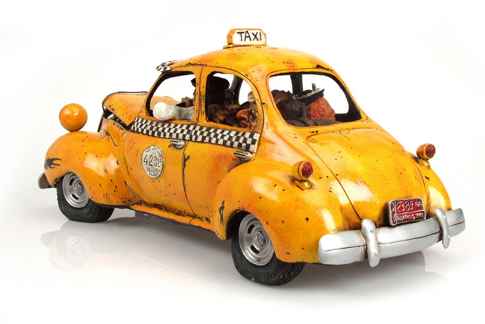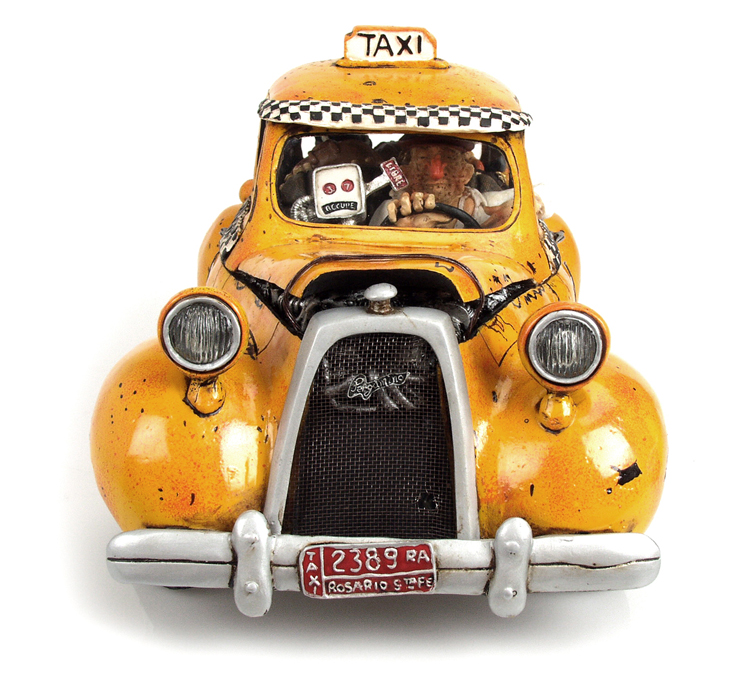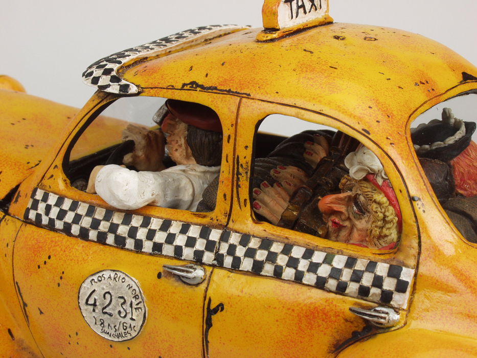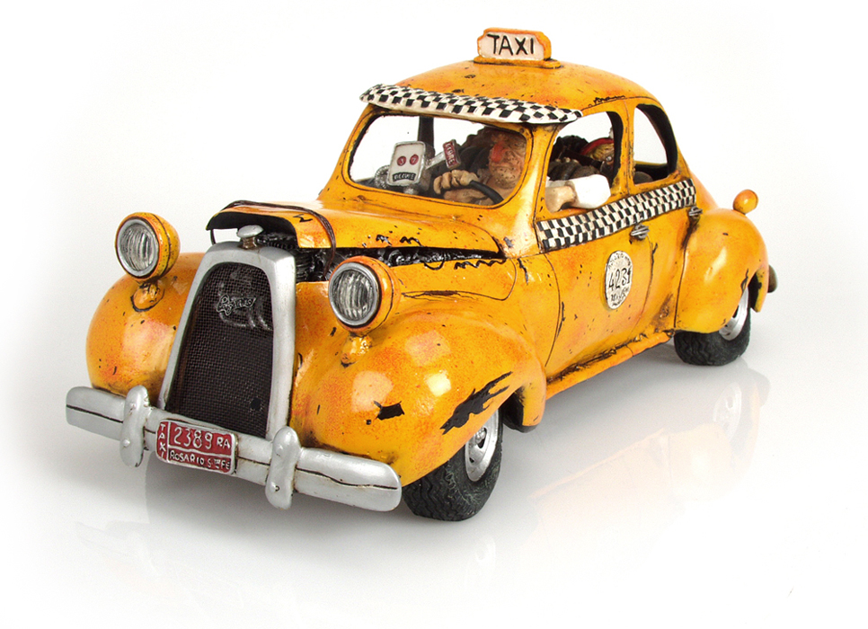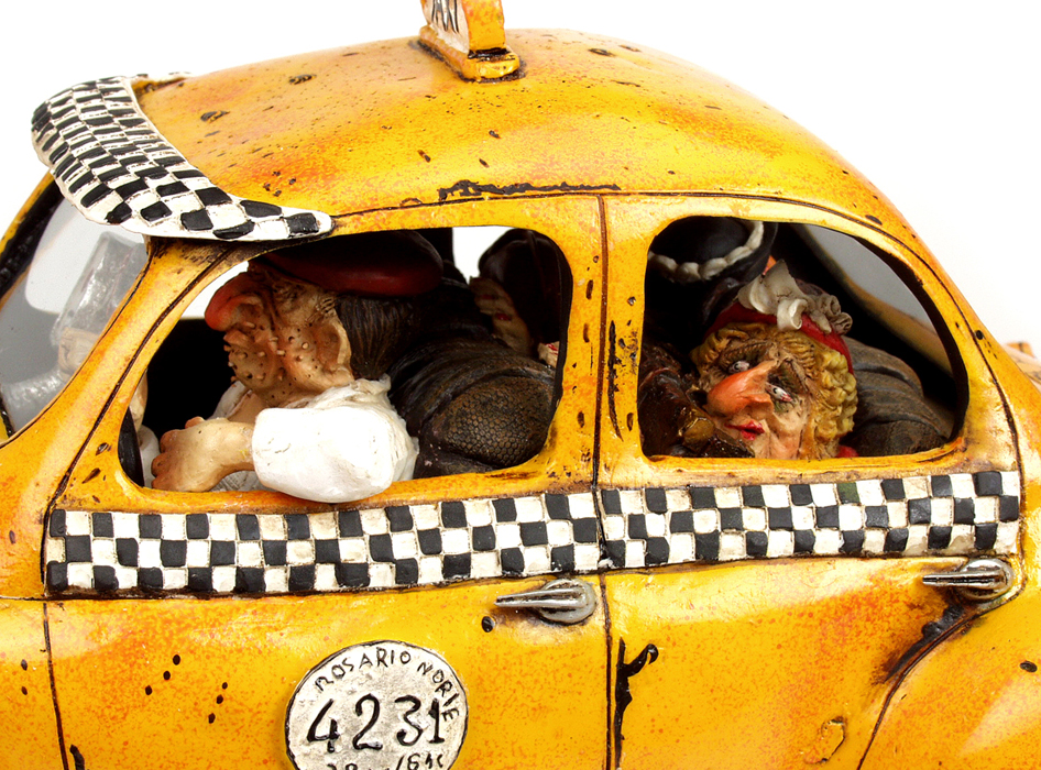 Die limitierten und nummerierte Editionen seiner Figuren sind begehrte Objekte für Liebhaber und Sammler. Überzeugen Sie sich selbst von der Qualität dieser fantastischen Arbeiten, die unter der ständigen Kontrolle des Künstlers Guillermo Forchino stehen. DIE GESCHICHTE: Die Sonne brannte vom Himmel. Eine lange Zugreise lag bereits hinter ihnen, als Marta Gaitan Barberio und ihre Freundin Mercedes Arana Calderon beschlossen, sich für die Heimfahrt ein Taxi zu nehmen. Das Taxi war alt und nicht gerade gut in Schuss, und seine ramponierte Karosserie wurde mit Eisendraht zusammengehalten. Der Fahrer dieses völlig lädierten Vehikels erlaubte es den Damen nicht einmal, ihr Gepäck in den Kofferraum zu legen, da der bereits mit sechs Dosen Würstchen, Grillschinken und drei Kästen Bier beladen war. Und auf den Vordersitz durften sie die Sachen erst recht nicht stellen, denn an den sollte nichts drankommen. Als das Taxi vor ihrem Haus angekommen war, mussten Marta und Mercedes Passanten bitten, sie aus ihrer eingezwängten Lage zu befreien. |