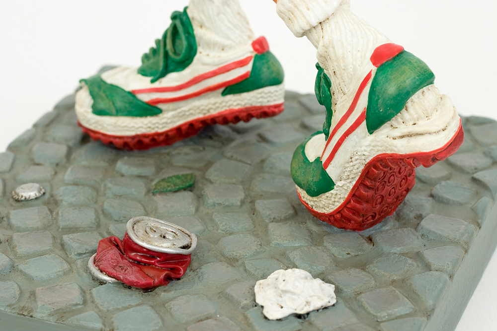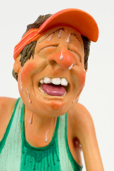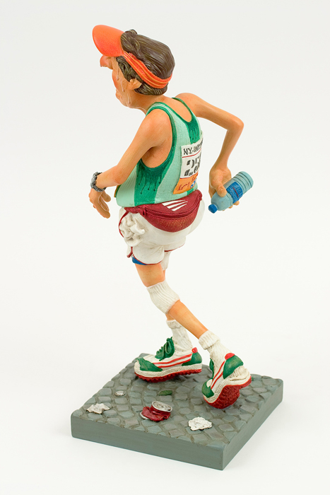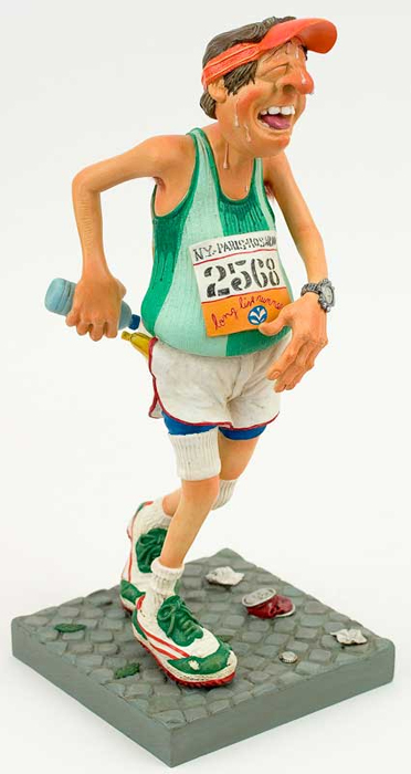Die Mischung aus Forchinos großen Sinn für Humor, mit einem starken Hauch Ironie verbunden, haben zur Comic Kunst Forchinos geführt. Die limitierten und nummerierte Editionen seiner Figuren sind begehrte Objekte für Liebhaber und Sammler. Überzeugen Sie sich selbst von der Qualität dieser fantastischen Arbeiten, die unter der ständigen Kontrolle des Künstlers Guillermo Forchino stehen. Der Stolz verbietet es Mauro Machado sich einzugestehen das er nicht mehr den Waschbrettbauch aus seiner Jugendzeit hat. Das Beste was er dafür tun konnte ist Laufen zu gehen, und so hat er sich für den diesjährigen Marathon angemeldet. Bei der Startaufstellung drängelte er sich durch Ellbogenhiebe und schupsen in die vorderste Reihe. Nach 50 Metern konnte er es kaum fassen -er führte das Feld an. Nach 100 Metern überholten ihn die ersten Läufer. Nach 500 Metern war er wieder allein, und schaute wehmütig seinen Mitstreitern hinterher, die sich immer weiter entfernten.Er wusste nicht ob es an seinem grandiosen Start gelegen hat, oder daran das er beide Wasserflaschen bereits nach 700 Metern gelehrt hatte, das er plötzlich einen stechenden Schmerz spürte .Nach 800 Metern schien er sich wie in Zeitlupe zu bewegen. Er schien zu träumen und konnte sein Arme und Beine nicht mehr spüren. Aber nein - er schwebte. Es war als o ob er sich selbst zuschaute, und sein ganzes Leben wie ein Film vor seine inneren Auge vorbeizog. Plötzlich holte eine sanfte Stimme ihn aus seinem Tranceartigen Zustand. Er realisierte das er auf dem Boden saß, und jemand an ihm rüttelte. Als er aufstehen wollte wurde er zurückgehalten und die Stimme sagte Bleiben sie bitte liegen, und hören sie auf so zu tun als seien sie Carl Lewis. Mit diesen Worten drückte der Sportarzt ihm die Sauerstoffmaske auf das Gesicht.. |