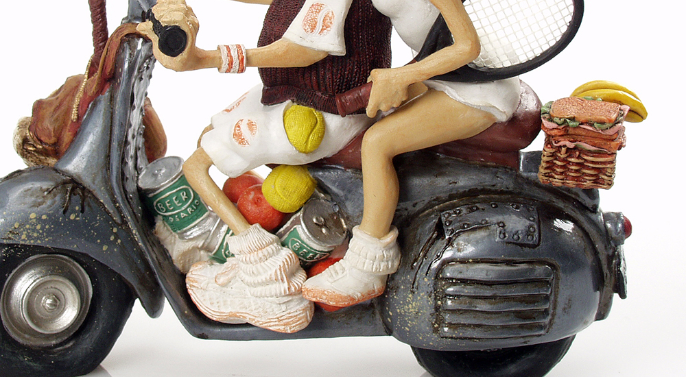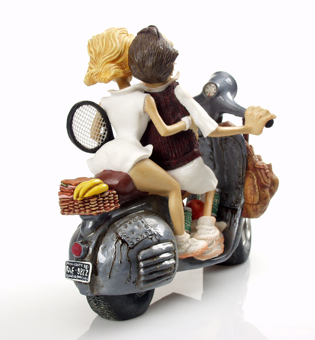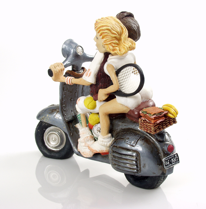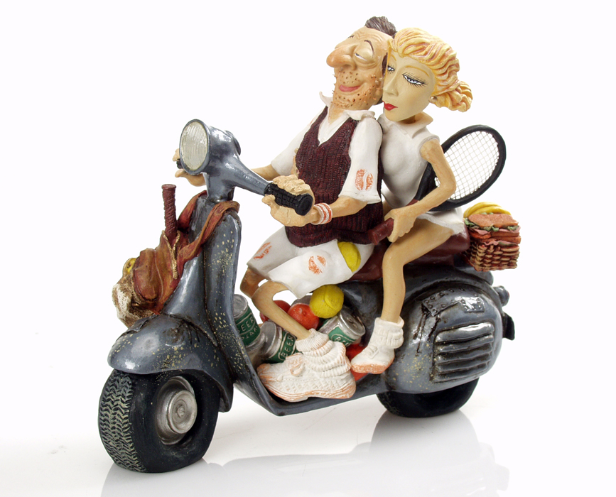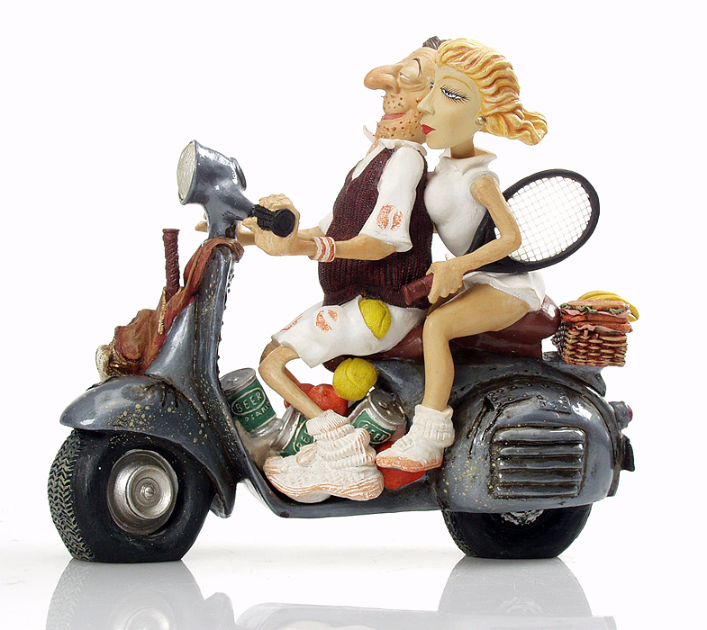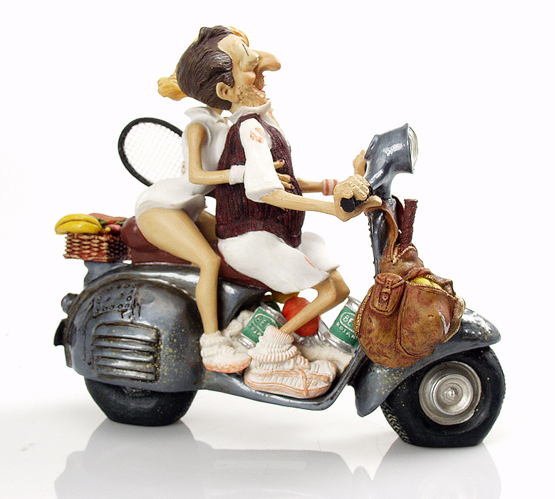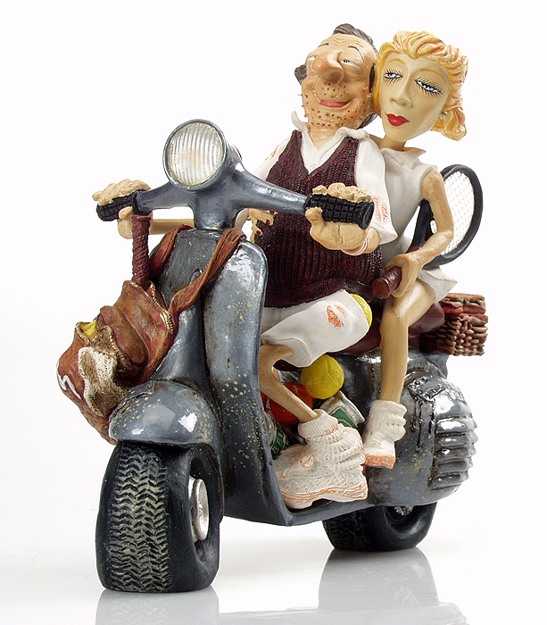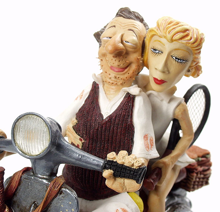Die Mischung aus Forchinos großen Sinn für Humor, mit einem starken Hauch Ironie verbunden, haben zur Comic Kunst Forchinos geführt. Die limitierten und nummerierte Editionen seiner Figuren sind begehrte Objekte für Liebhaber und Sammler. Überzeugen Sie sich selbst von derQualität dieser fantastischen Arbeiten, die unter der ständigen Kontrolle des Künstlers stehen. DIE GESCHICHTE: Herr Doktor Jorge Perochena spielte nie Tennis. Für ihn war es ein langweiliges Spiel, wo man nur immer wieder einen kleinen gelben Ball schlägt. An dem Tag, als er herausfand, das die liebliche Adriana Harari sehr gerne Tennis spielt, meldete er sich sofort zu einem Intensiv - Kurs an .Er kaufte sich einen teuren Schläger, eine modische Shorts, ein Krokodilhemd und extra federnde Tennisschuh Eine Woche später lud er sie zu einem Freundschaftsspiel ein. Jorge verlor das Spiel zwar in zwei Sätzen, 6-0/6-0, konnte aber den Ball dreimal erreichen !!. Das war ihm aber unwichtig, da er sein Ziel erreicht hatte - eine Fahrt auf seinem Motorroller mit der tollen Adriana als Sozius, die ihn mit ihren Armen umschlang. |