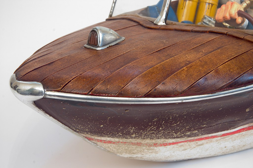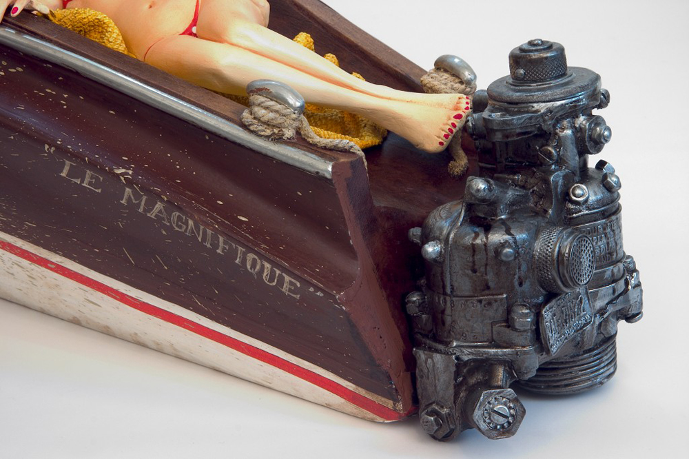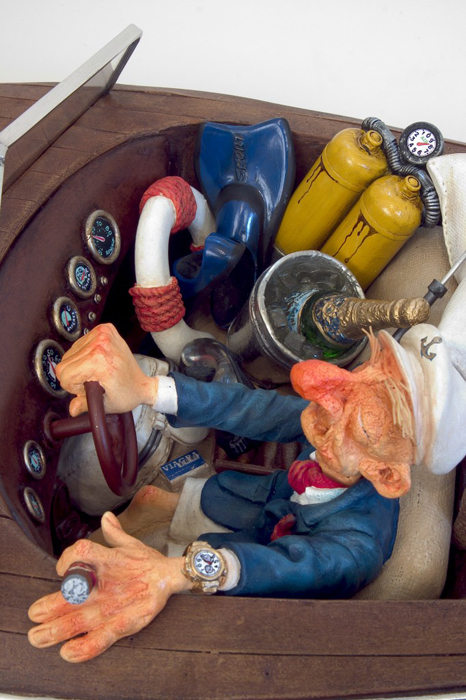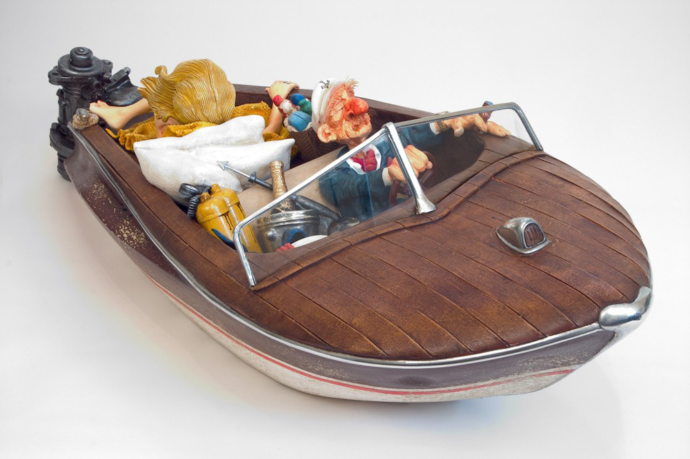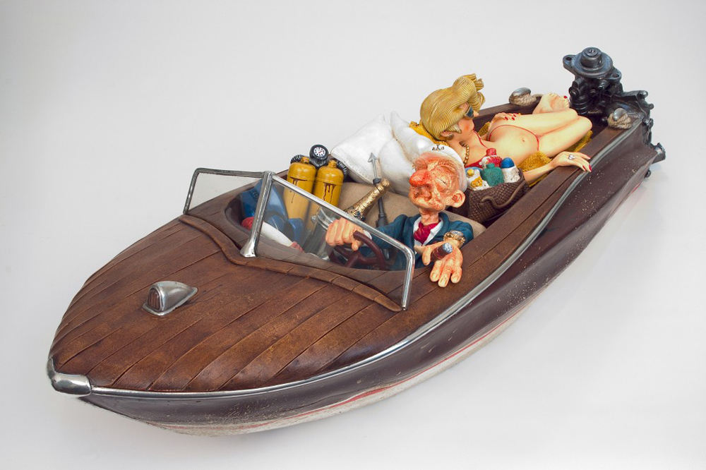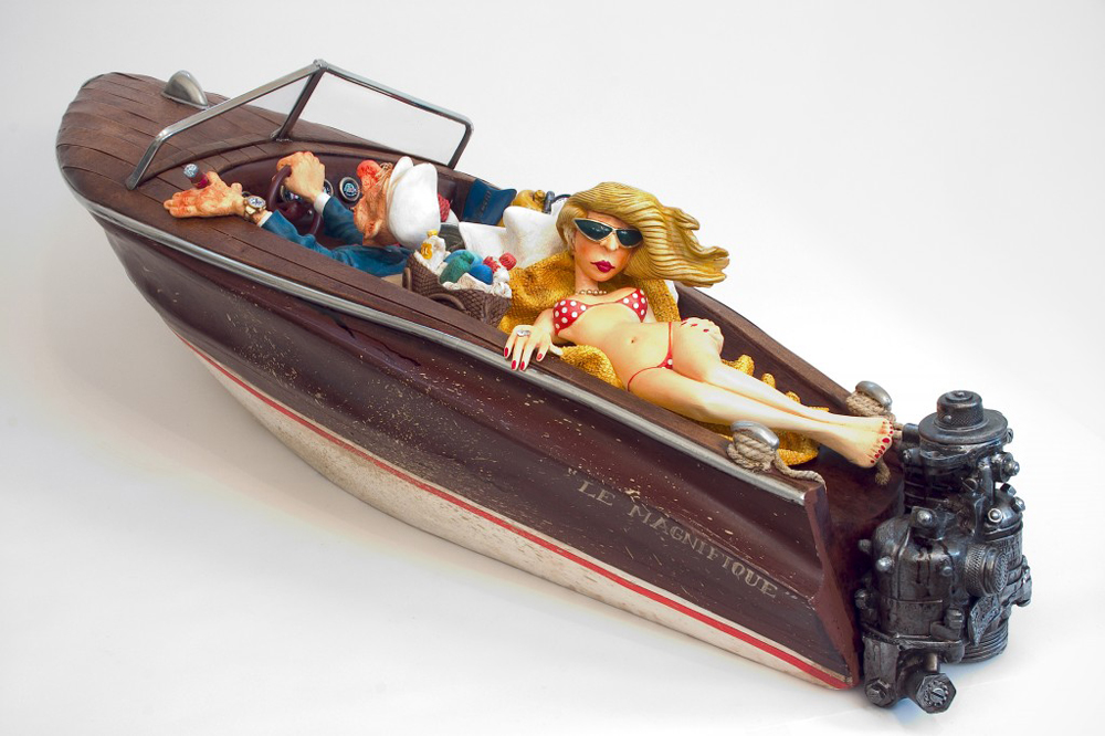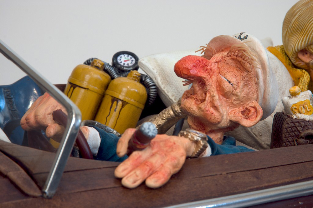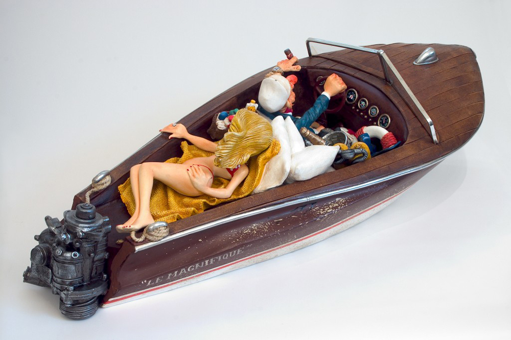 Im Jahr 1980 hat der Künstler Guillermo Forchino angefangen, mit verschiedenen Materialien an der Facultad de Bellas Artes Rosario, Argentinien zu experimentieren, um die richtige Gestalt für seine dreidimensionale Kunst zu finden. Seine Studien gingen an der Uni von der Sorbonne weiter. Guillermo Forchino lernte, wie man mit altmodischen Materialien wie Wachs, Resin, Leim, und traditionellen Verbindungen arbeitet. Mit der Erfahrung in den an der Sorbonne gelernten Methoden ist Guillermo Forchino nach Rosario zurückgekehrt, wo er anfängt, gegenständliche Skulpturen aus geballtem Stoff herzustellen. Dabei benutzte Guillermo Forchino zart gefärbtes Papiermache für die sichtbaren Teile. In den späten 80er Jahren hat Forchino angefangen, Resine für seine witzigen Skulpturen zu benutzen. DIE GESCHICHTE: Calolo Oviedo war schon immer ein Dandy. Er liebte die Gesellschaft von jungen Frauen mit langen Beinen und üppigem Körper. Als er Delma traf war er sofort in sie verliebt- Liebe auf der ersten Blick. Und als die hinreißende Delma herausfand, dass Mr. Oviedo viele Ölgesellschaften hatte , war sie auch sofort verliebt. An einem Nachmittag voller Leidenschaft, hätte Calolo fast seine Jacht zum Kentern gebracht. Sie hätten ihn sehen sollen. Er lief in seiner Badehose , mit einer Flasche Champagner in der Hand, hinter der Frau seines Herzens her. Was für Leidenschaft!! Egal, dass Calolo auf einer Bank stehen musste um seine Geliebte zu küssen und Pillen nehmen musste um seine Kraft zu erhalten. Die Leidenschaft seiner Liebe ging so schnell wie seine Aktien nach oben. Bis zu dem Moment als er in Ohmacht fiel, und sein Arzt sagte er müsseseine Liebeslust zügeln |